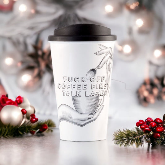 F***k Off, Coffee First, Talk Later Reusable Travel Cup
